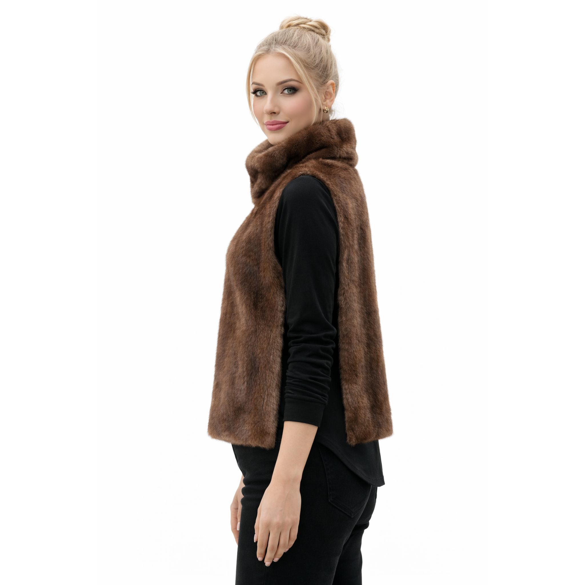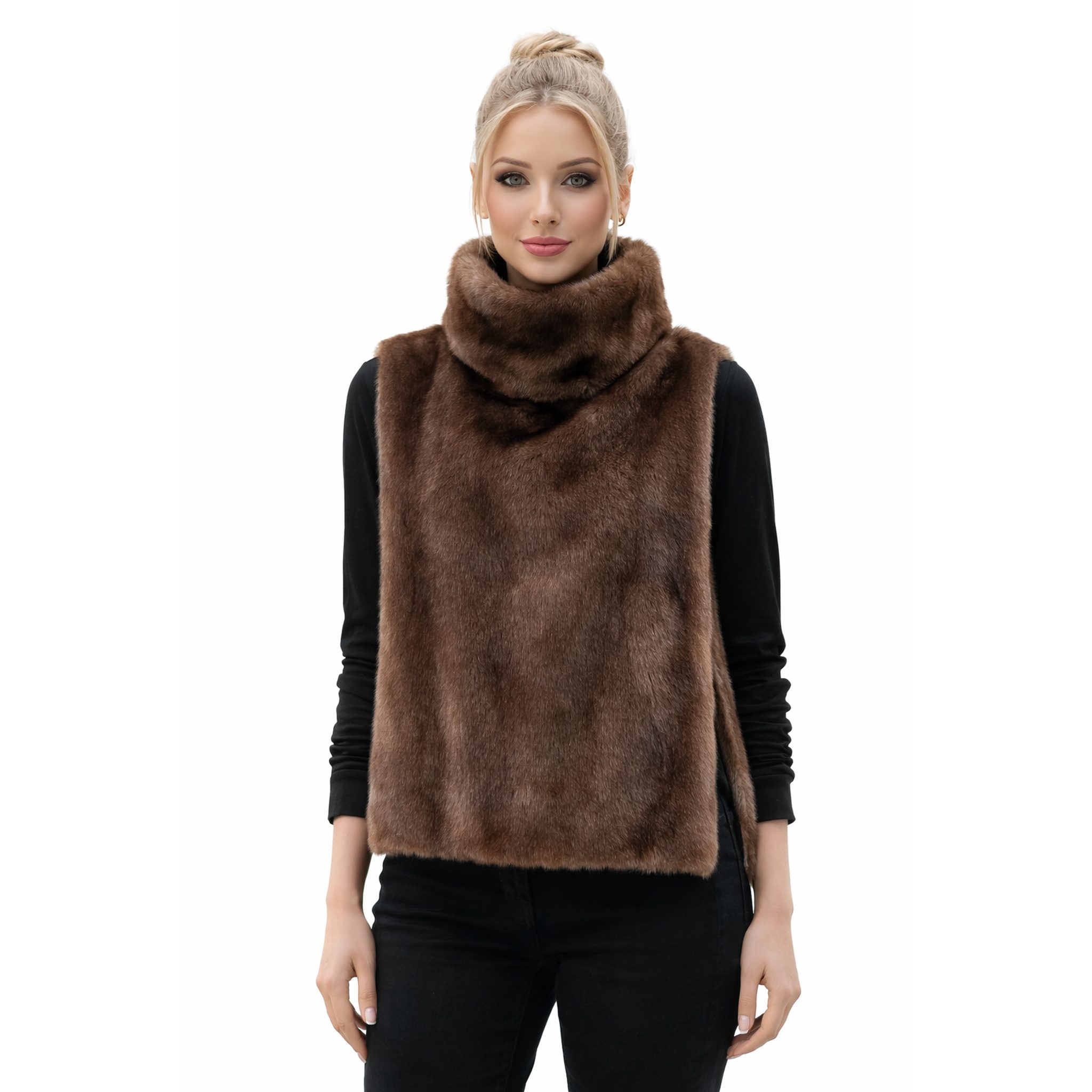 Chaleco de piel sintética con cuello chimenea, ideal para aportar estilo y calidez a tus looks de otoño e invierno. Confeccionado en suave pelo sintético, destaca por su diseño sin mangas y su apertura lateral, que aporta comodidad y movimiento.