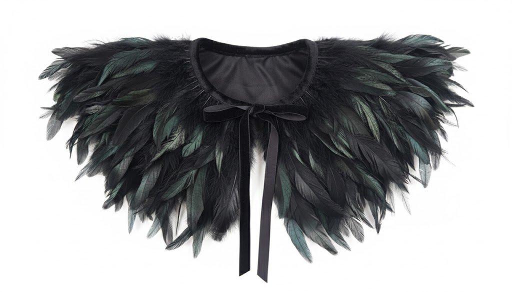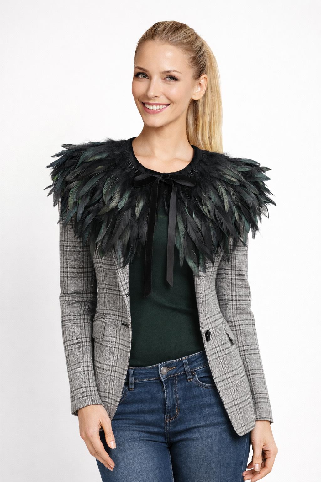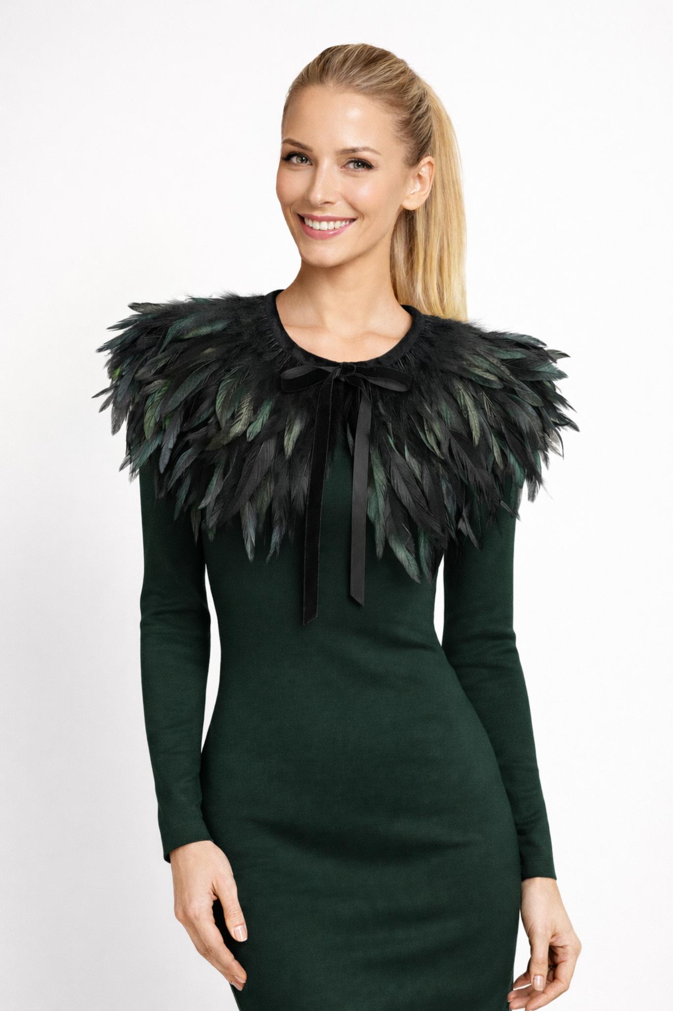 Cuello de plumas en color negro con sutiles matices verdes, un complemento sofisticado y con personalidad que aporta fuerza y elegancia a cualquier estilismo. Su diseño envolvente realza el cuello y los hombros, creando un efecto visual muy especial y favorecedor.