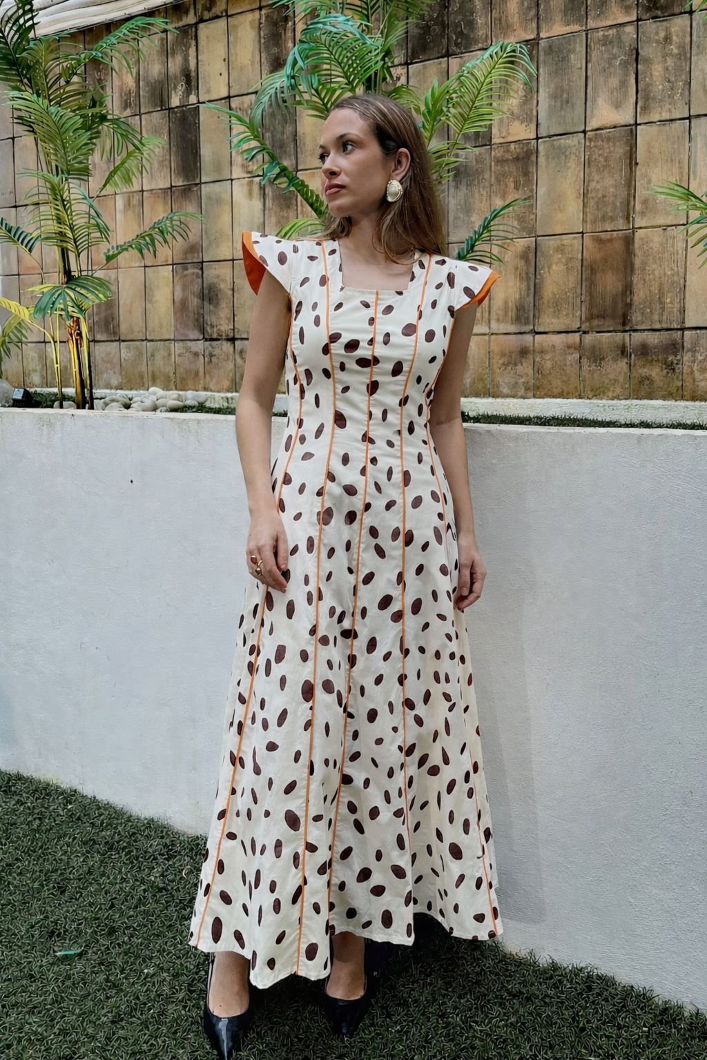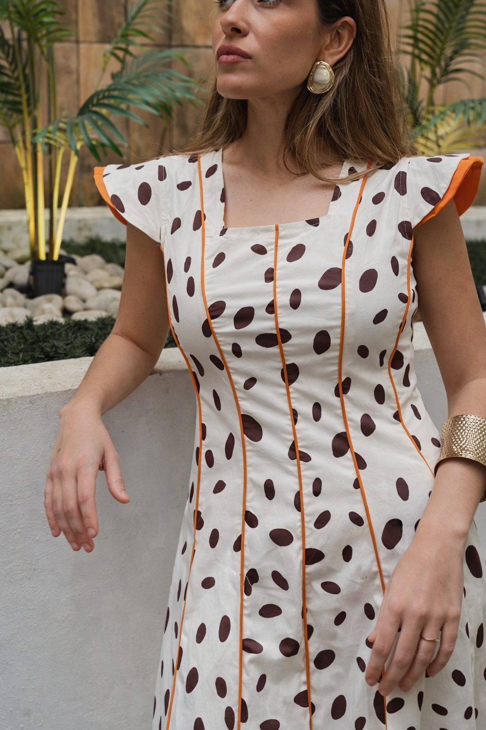 El estampado en tonos cálidos sobre fondo claro lo convierte en una pieza especial y muy versátil, mientras que las líneas verticales en contraste estilizan visualmente la figura. Las mangas con una pequeña solapa añaden un toque femenino y delicado, ideal para ocasiones especiales o eventos donde quieras sentirte única.