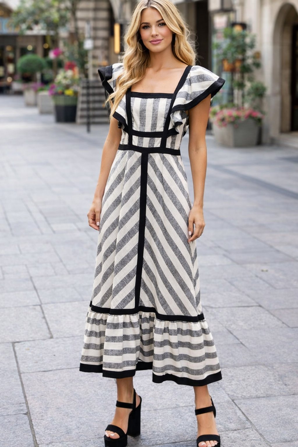 Vestido corte midi en tejido de lino y estampado de rayas, con escote cuadrado y mangas con volante que aportan un toque romántico y femenino. Su diseño combina rayas verticales y diagonales estilizando la silueta, realzado con detalles en contraste que enmarcan la figura. Bajo con volante que aporta movimiento y elegancia. Perfecto para eventos de día, cenas especiales o looks sofisticados.