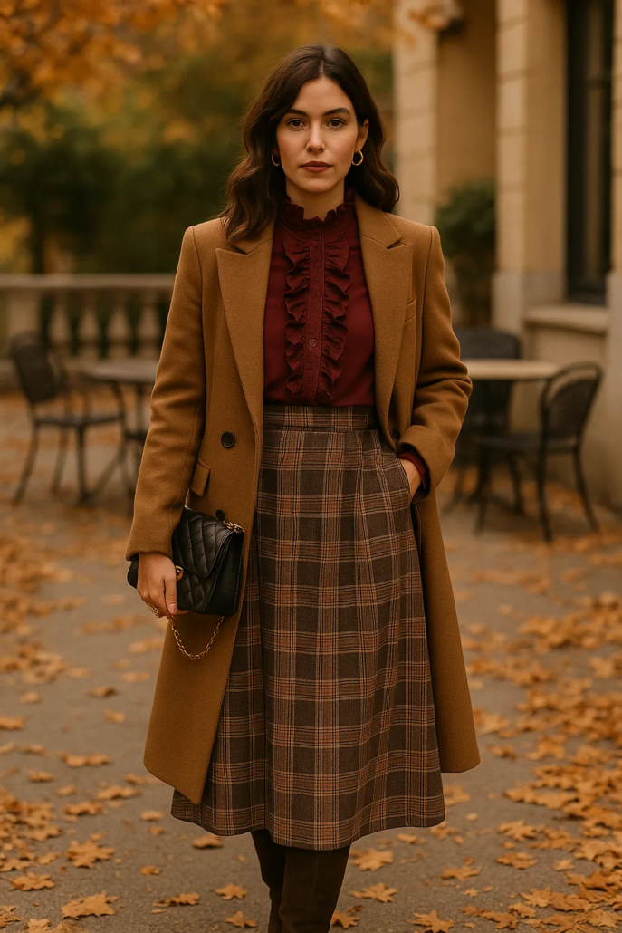 Una camisa de chorreras vaporosa bajo un chaleco o una chaqueta estructurada en cuadros crea un equilibrio perfecto entre lo clásico y lo contemporáneo.